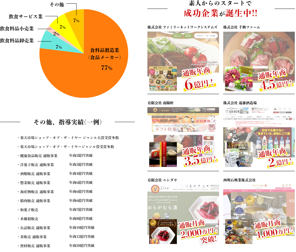 立ち上げ3ヶ月目で月商1,000万円突破(当時楽天市場内最速記録)という店舗を開発するなど、食品通販戦略構築のスペシャリストであり、クライアントには楽天市場ショップ・オブ・ザ・イヤー受賞店舗も非常に多い。